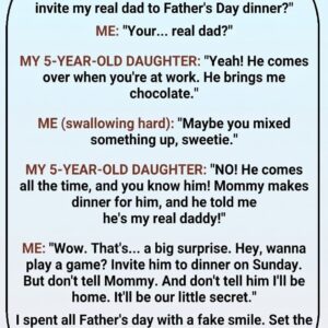 Father’s Day shattered in a single sentence. My daughter looked up at me with steady eyes and asked if we could invite her “real dad” to dinner….