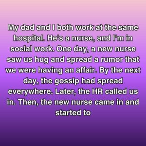 My dad and I both work at the same hospital. He’s a nurse, and I’m in social work. One day, a new nurse saw us hug and…