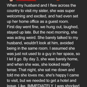 Tina and her husband, Kurt, flew cross-country to visit her sister Sasha, expecting a peaceful week of family bonding. At first, everything felt perfect—wine, laughter, and warmth….