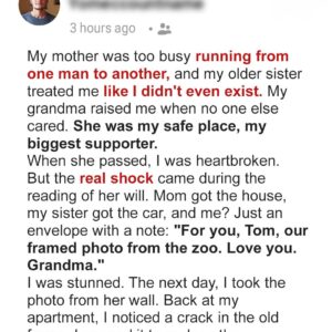 When my grandmother, Grace, passed away, my mother and sister inherited her house and car. All I got was a framed photo of us at the zoo….