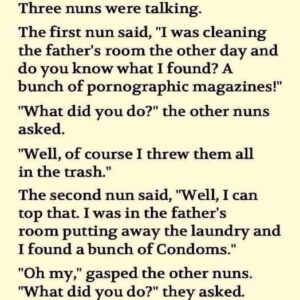 Three nuns were talking. The first nun said, “I was cleaning the father’s room the other day and do you know what I found? A bunch of…
