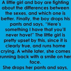 A little girl and boy are fighting about the differences between the sexes, and which one is better. Finally, the boy drops his pants and says, “Here’s…