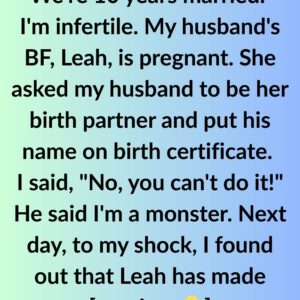 We’re 10 years married. I’m infertile. My husband’s BF, Leah, is pregnant. She asked my husband to be her birth partner and put his name on the…