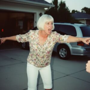 She had both arms out like loaded pistols, voice so sharp the neighbor’s porch light flicked on. Mom—floral blouse, white shorts, jaw set—planted herself in the middle…