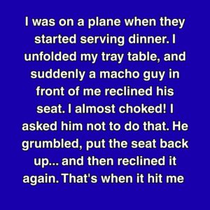 I was on a plane when they started serving dinner. I unfolded my tray table, and suddenly a macho guy in front of me reclined his seat….