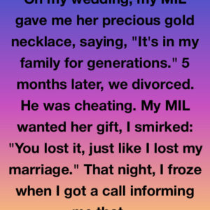 On my wedding, my MIL gave me her precious gold necklace, saying, “It’s in my family for generations.” Five months later, we divorced. He was cheating. My…