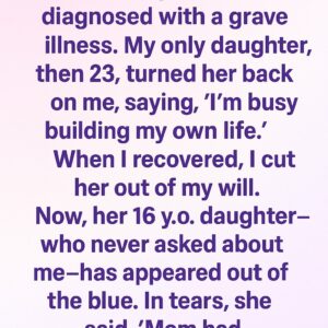 Years ago, I was diagnosed with a grave illness. My only daughter, then 23, turned her back on me, saying, ‘ I’m busy building my own life.’…