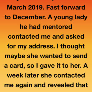 My adult son passed in March 2019. Fast forward to December. A young lady he had mentored contacted me and asked for my address. I thought maybe…