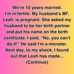 We’re 10 years married. I’m infertile. My husband’s best friend, Leah, is pregnant. She asked my husband to be her birth partner and put his name on…