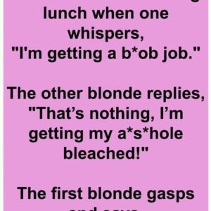 Two blondes are having lunch when one whispers, I’m getting a boob job.”Two blondes are having lunch when one whispers, The other blonde replies, “That’s nothing, I’m…