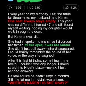 On my 47th birthday, I set the table for three—one seat left heartbreakingly empty. For two years, my daughter Karen had refused to speak to me. The…