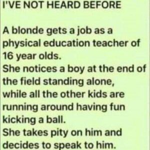 A blonde gets a job as a physical education teacher of 16-year-olds. She notices a boy at the end of the field standing alone, while all the…