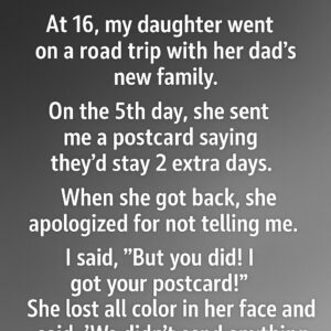 At 16, my daughter went on a road trip with her dad’s new family. On the 5th day, she sent me a postcard saying they’d stay 2…