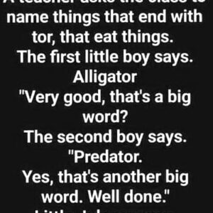 A teacher asks the class to name things that end with “tor” and eat things. The first boy says, “Alligator.” The teacher responds, “Very good, that’s a…