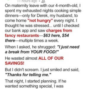 On maternity leave with our 4-month-old, I spent my exhausted nights cooking simple dinners—only for Derek, my husband, to come home “not hungry” every night. I thought…