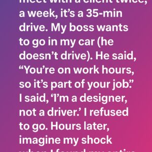 My boss and I were required to meet a client twice a week, a 35-minute drive away. Since he didn’t drive, he assumed I’d take him in…