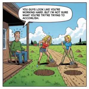 A man is sitting on his porch when he notices two blondes working down the road. They both have shovels. One of the blondes digs a hole,…