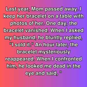 Last year, Mom passed away. I keep her bracelet on a table with photos of her. One day, the bracelet vanished. When I asked my husband, he…