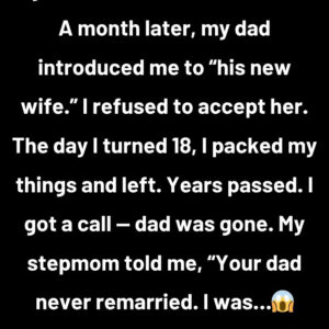 I refused to accept her. The day I turned 18, I packed my things and left. Years passed. I got a call – dad was gone. My…