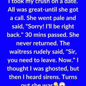 I took my crush on a date. All was great—until she got a call. She went pale and said, “Sorry! I’ll be right back.” 30 minutes passed….