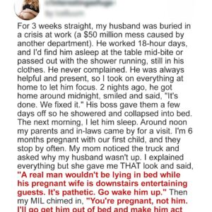 After weeks of eighteen-hour shifts fixing a company crisis, my husband Marcus finally collapsed into bed. Exhausted, pale, and worn down, he was asleep within minutes. I…