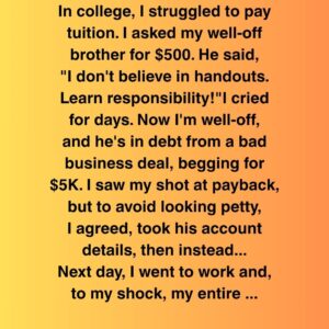 In college, I struggled to pay tuition. I asked my well-off brother for $500. He said, “I don’t believe in handouts. Learn responsibility!” I cried for days….