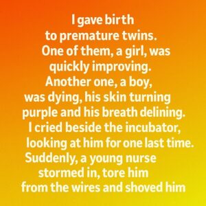 I gave birth to premature twins. One of them, a girl, was quickly improving. Another one, a boy, was dying, his skin turning purple and his breath…