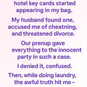 Months after our wedding, hotel key cards started appearing in my bag. My husband found one, accused me of cheating, and threatened divorce . Our prenup gave…