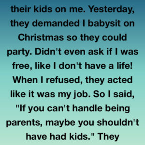 My son and DIL love dumping their kids on me. Yesterday, they demanded I babysit on Christmas so they could party. Didn’t even ask if I was…