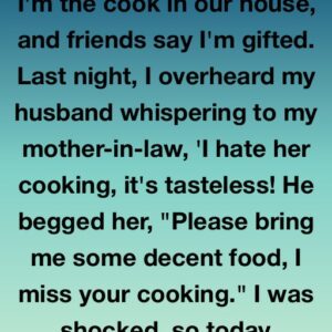 I’m the cook in our house, and friends say I’m gifted. Last night, I overheard my husband whispering to my mother-in-law, ‘I hate her cooking, it’s tasteless!’…
