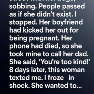 I was walking home from work on a gray, tired evening when I saw her—standing near the bus stop with two stuffed grocery bags at her feet, tears running down her face like she was trying to breathe through heartbreak.