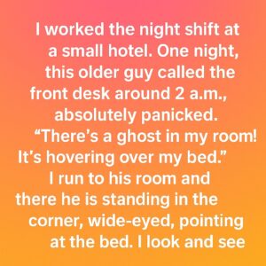 I worked the night shift at a small hotel. One night, this older guy called the front desk around 2 a.m., absolutely panicked. “There’s a ghost in…