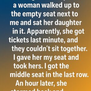 Apparently, she got tickets last minute, and they couldn’t sit together. I gave her my seat and took hers. I got the middle seat in the last…