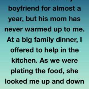 I’ve been with my boyfriend for almost a year, but his mom has never warmed up to me. At a big family dinner, I offered to help…