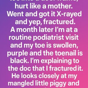I smashed my left pinky toe into a door frame, hurt like a mother. Went and got it X-rayed and yep, fractured. A month later, at a…