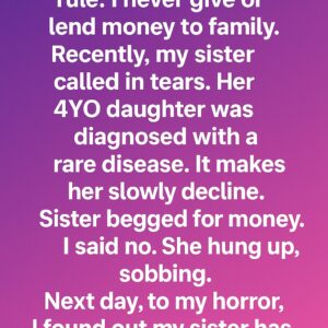 (35F) have one firm rule: I never give or lend money to family. Recently, my sister called in tears. Her 4YO daughter was diagnosed with a rare…