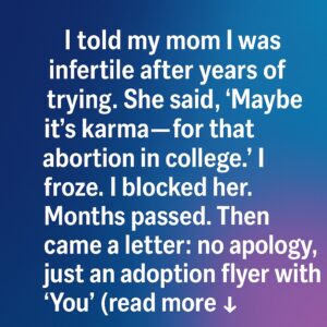 I told my mom I was infertile after years of trying. Her response cut deeper than anything I’d ever heard: “Maybe it’s karma.” I froze, unable to comprehend…