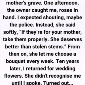 A Bouquet for My Mother When I was twelve, I used to steal flowers from a small shop down the street to place on my mother’s grave. She had passed away the year before, and my father worked long hours, too exhausted to notice how often I slipped out of the house. I had no money of my own. But bringing flowers to her grave made me feel closer to her—as if a small bit of beauty could somehow bridge the distance between the living and the lost. One afternoon, the shop owner finally caught me. I was standing there with a handful of roses, my heart pounding so loudly I could barely breathe. I expected shouting. Maybe even the police. But instead, the woman—who looked to be in her fifties, with kind but slightly tired eyes—simply said, “If they’re for your mother, take them properly. She deserves better than stolen stems.” I stared at her, confused. My lips trembled as I whispered, “You’re… not angry?” She shook her head. “No. But next time, come through the front door.” The Kindness That Changed Everything From that day forward, everything changed. Every week after school, I would stop by the flower shop. I’d brush the dirt off my shoes before stepping inside and quietly tell her which flowers I thought my mother might like that day—lilies, tulips, or sometimes daisies. She never asked me for a single cent. Sometimes she would smile and say, “Your mother had good taste,” before slipping an extra flower into the bouquet. Those afternoons became my secret refuge. The shop always smelled like fresh soil and sunshine. It was a place where life kept growing, even when grief felt overwhelming. The woman never asked for anything in return. She simply gave—with a quiet kindness that asked for no explanation. Ten Years Later Ten years passed. I left town, went to college, and slowly built a life of my own. But I never forgot the woman who had shown a grieving child such unexpected kindness. When I finally returned, it was for a much happier reason. My wedding. I walked back into the same flower shop. It looked a little smaller now, a little older. The paint on the sign had faded, but the scent inside was exactly the same….