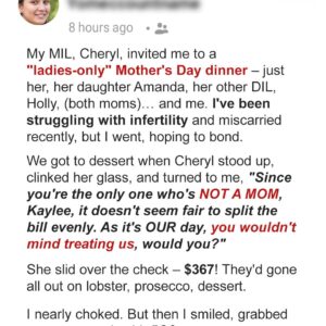 On Mother’s Day, my mother-in-law handed me a $367 dinner check and said, “This is your gift to the real moms at the table.” I smiled, paid…