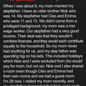 Growing up, my stepdad, Liam, made it clear my brother Nick and I were outsiders. While he spoiled his daughters with vacations and their own rooms, we…